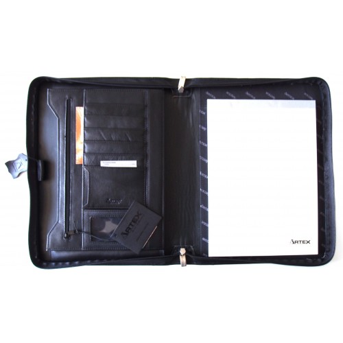The Business buddy we've all been looking for. Keep all of your important papers and business items in place with this functional zip-around folio. Designed to hold a spiral bound book or A4 pad (pad included). It features roomy pockets and document sections, an all leather interior and extra wide leather gussets aroung the whole folio, giving it generous width for all your items. Crafted from the finest leather.