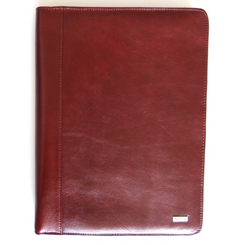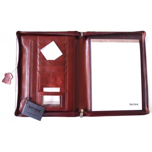 place with this functional zip-around folio. Designed to hold a spiral bound book or A4 pad (pad included). It features roomy pockets and document sections, an all leather interior and extra wide leather gussets aroung the whole folio, giving it generous width for all your items. Crafted from the finest leather.