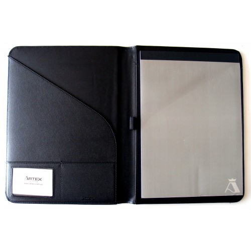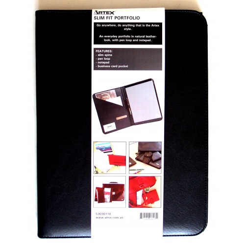 Slim fit portfolio is an everyday portfolio in natural leather-look , with pen loop and notepad. Features a slim spine, slot for holding paperspen loop, notepad and business card pockets.